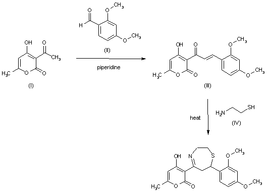 The condensation of 3-acetyl-4-hydroxy-6-methyl-2H-pyran-2-one (I) with 2,4-dimethoxybenzaldehyde (II) by means of piperidine in refluxing ethanol gives the acryloyl derivative (III), which is finally cyclized with 2-aminoethanethiol (IV) in refluxing ethanol to afford the target thiazepine derivative.