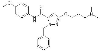 Condensation of 1-benzyl-3-hydroxy-1H-pyrazole-5-carboxylic acid methyl ester (I) with 3-(dimethylamino)-1-propanol (II) by means of 1,1'-(azodicarbonyl)dipiperidine and tributylphosphine under Mitsunobu conditions afforded the dimethylaminopropyl ether (III). After basic hydrolysis of the methyl ester group of (III), the resultant carboxylic acid (IV) was coupled with 4-methoxyaniline (V) using HATU to furnish the title amide.