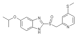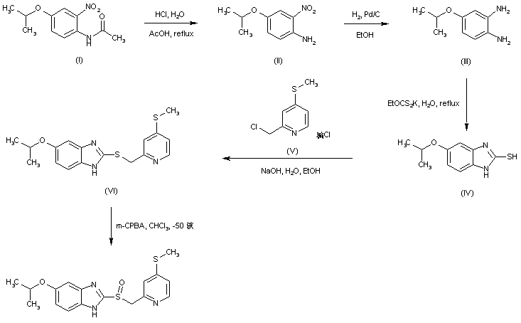 Acid hydrolysis of acetanilide (I) provided nitro aniline (II), which was further reduced to diamine (III) by catalytic hydrogenation over Pd/C. The 2-mercapto benzimidazole (IV) was then synthesized by condensation of phenylenediamine (III) with potassium ethyl xanthate. Alkylation of (IV) with the chloromethyl pyridine (V) produced the corresponding thioether adduct (VI). Finally, selective oxidation of the benzimidazolyl sulfur atom of (I) using m-chloroperbenzoic acid gave rise to the title sulfoxide.