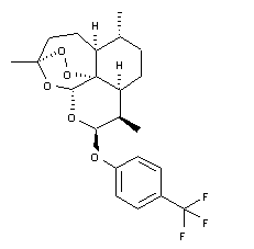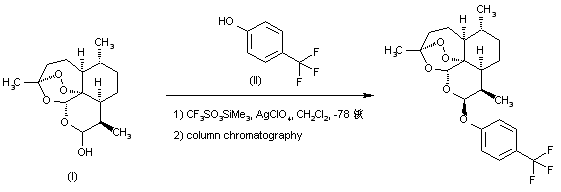 Coupling of dihydroartemisinin (I) with p-trifluoromethylphenol (II) in the presence of trimethylsilyl triflate and silver perchlorate at -78 C produced the corresponding aryl ether as an epimeric mixture. The major 10-beta isomer was then isolated from the reaction mixture by column chromatography.