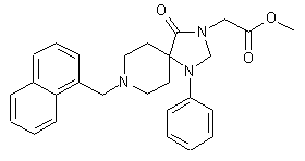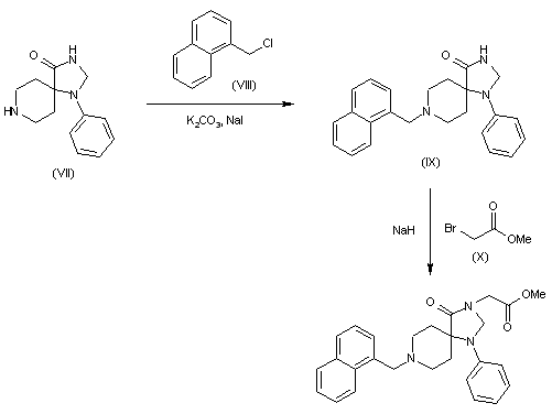 Solution synthesis: In this case the target product is obtained by alkylation of 1-phenyl-1,3,8-triaza-spiro[4.5]decan-4-one (VII) with 1-(chloromethyl)naphthalene (VIII) by means of K2CO3 and NaI in refluxing 2-butanone, followed by acylation with methyl bromoacetate (X) in DMF by means of NaH.