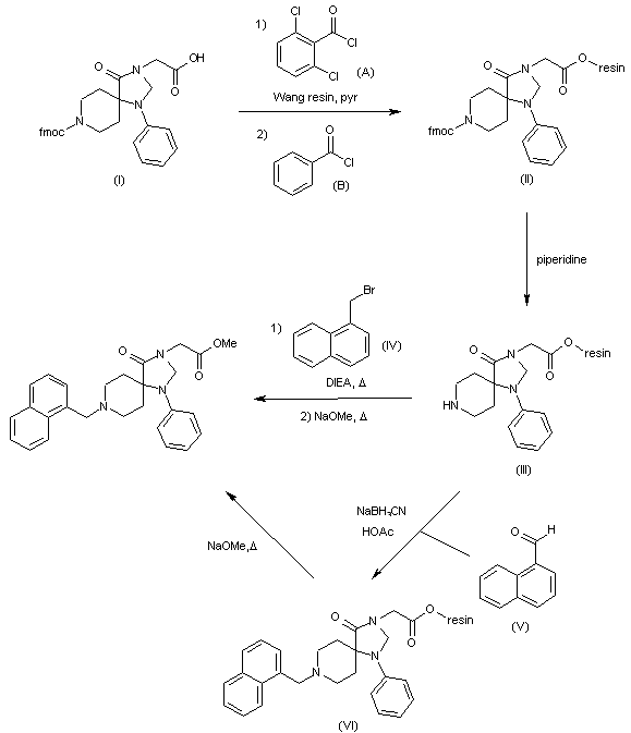 Solid phase synthesis: Attachment of 8-Fmoc-3-carboxymethyl-1-phenyl-1,3,8-triazaspiro[4.5]decan-4-one (I) to Wang resin by means of 2,6-dichlorobenzoyl chloride (A) in DMF in the presence of pyridine, followed by treatment with benzoyl chloride (B) in dichloromethane in the presence of pyridine, provides resin-anchored derivative (II). Treatment of resin (II) with piperidine in DMF allows Fmoc removal to yield deprotected piperidine derivative (III), which is then converted into the target compound by alkylation with 1-(bromomethyl)naphthalene (IV) by heating in DMSO in the presence of DIEA, followed by cleavage of the molecule from the resin by heating with NaOMe in THF/MeOH. Alternatively, the conversion of (III) into the desired compound can be achieved by reductive amination between resin (III) and aldehyde (V) by means of NaBH3CN in THF in the presence of HOAc to afford anchored derivative (VI), followed by cleavage from the resin by heating with NaOMe in THF/MeOH.