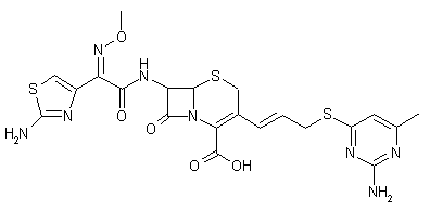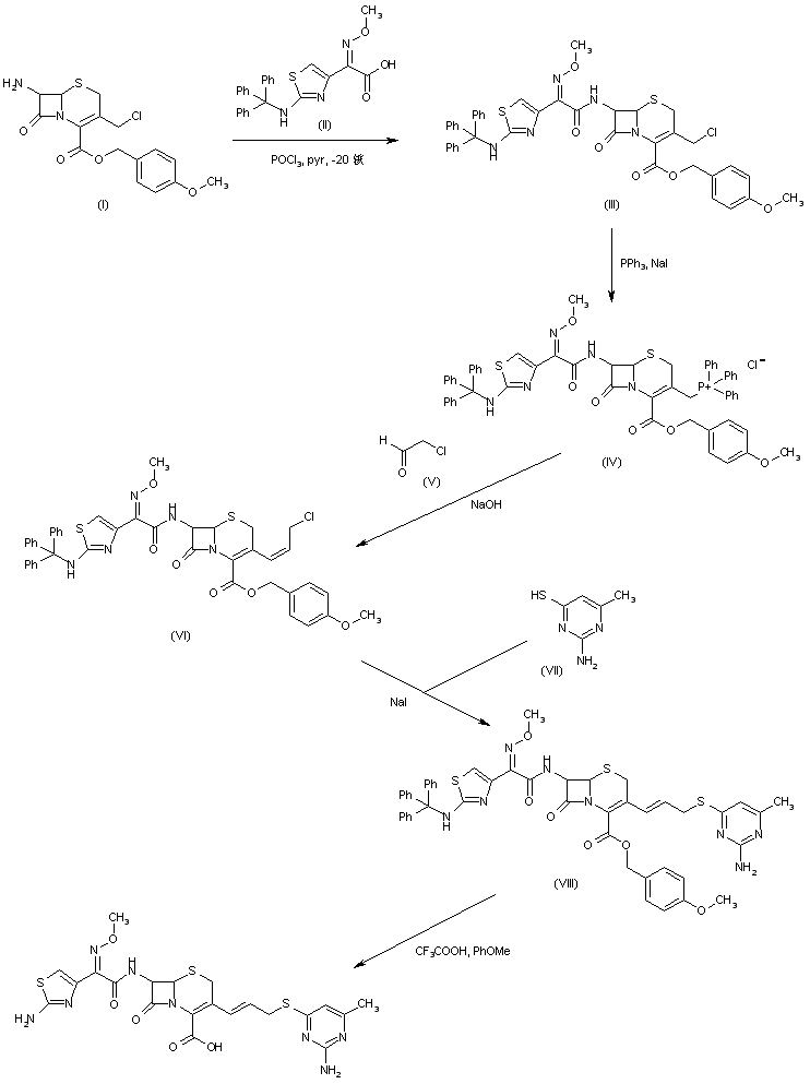 Coupling of carboxylic acid (II) to the 7-aminocephem derivative (I) using POCl3 and pyridine produced the corresponding amide (III). Displacement of the chloro group of (III) with triphenyl phosphine furnished the phosphonium salt (IV), which was subjected to a Wittig reaction with chloroacetaldehyde (V), yielding the Z-propenyl chloride (VI). Subsequent reaction of allyl chloride (VI) with 4-amino-2-mercapto-6-methylpyrimidine (VII) in the presence of NaI produced the E-propenyl sulfide (VIII). The N-trityl group and the p-methoxybenzyl ester of (VIII) were finally cleaved by treatment with trifluoroacetic acid in anisole to furnish the title compound.
