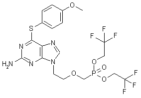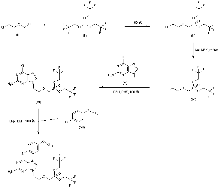 Phosphonate (III) was prepared by the Michaelis-Arbuzov reaction by heating a mixture of 2-chloroethyl chloromethyl ether (I) and tris(2,2,2-trifluoroethyl)phosphite (II) at 160 C. The chloroethoxy derivative (III) was then converted to the corresponding iodide (IV) by treatment with NaI under Finkelstein reaction conditions. Alkylation of 2-amino-6-chloropurine (V) with iodide (IV) in the presence of DBU furnished the phosphonyl purine (VI). The 6-chloro group of (VI) was finally displaced with p-methoxythiophenol (VII) in hot DMF, yielding the target thioether.