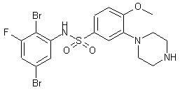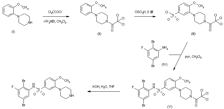 1-(2-Methoxyphenyl)-4-trichloroacetylpiperazine (II), prepared from 1-(2-methoxyphenyl)piperazine (I) and trichloroacetyl chloride, was treated with chlorosulfonic acid to give the sulfonyl chloride (III). Coupling of chloride (III) with 2,5-dibromo-3-fluoroaniline (IV) afforded sulfonamide (IV). Finally, removal of the trichloroacetyl protecting group under basic conditions provided the title piperazine derivative.