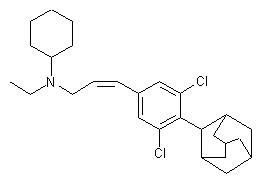 Preparation of the intermediate aryl triflate (V) is shown is Scheme 29890101a. The dilithiated derivative of 4-bromo-3,5-dichlorophenol (I) is condensed with 2-adamantanone (II) to produce the carbinol adduct (III). Reduction of the tertiary alcohol of (III) by means of concentrated HI in boiling AcOH leads to the adamantanyl phenol (IV). This is then reacted with trifluoromethanesulfonic anhydride in cold pyridine to yield sulfonate (V).