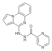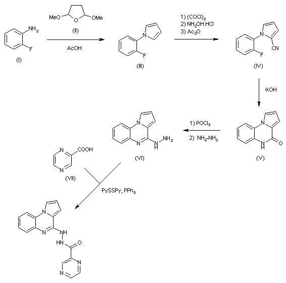 Clauson-Kaas reaction between 2-fluoroaniline (I) and 2,5-dimethoxytetrahydrofuran (II) in refluxing HOAc affords pyrrolic compound (III), which is then converted into cyanopyrrole derivative (IV) through a one-pot sequence involving formylation with oxalyl chloride, oximation with NH2OH.HCl and dehydration with Ac2O. Cyclization of nitrile (IV) by treatment with KOH in ethylene glycol or in tert-butyl alcohol yields quinoxalinone derivative (V), which is then transformed into the hydrazine derivative (VI) by refluxing with POCl3 and catalytic N,N-dimethylaniline followed by treatment with hydrazine in MeOH. Finally, the desired product is obtained by reaction of (VI) with pyrazinecarboxylic acid (VII) in the presence of PPh3 and 2,2'-dipyridyl disulfide (Aldrithiol-2) in CH2Cl2.