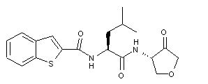 Asymmetric opening of epoxide (I) with trimethylsilyl azide in the presence of (R,R)-N,N'-bis(3,5-di-tert-butylsalicylidene)-1,2-cyclohexanediamino-chromium as the chiral catalyst (Salen catalyst) provided the (3S,4R)-azido silyl alcohol (II). Removal of the silyl group with camphorsulfonic acid in MeOH and subsequent reduction of the azido moiety of (II) with hydrogen in the presence of Pd/C afforded the amino alcohol (III). Coupling of (III) with the mixed anhydride prepared from N-Cbz-leucine (IV) and isobutyric acid gave amide (V). The N-carbobenzoxy group of (V) was then removed by hydrogenolysis, yielding amine (VI), which was coupled with benzothiophene-2-carbonyl chloride (VII) to furnish the diamide (VIII). The secondary alcohol of (VIII) was finally oxidized to the target ketone using the Dess-Martin reagent in CH2Cl2.