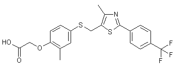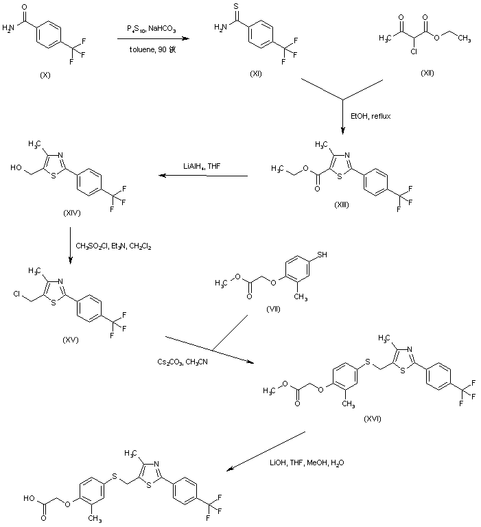 4-Trifluoromethylbenzamide (X) was converted to the corresponding thioamide (XI) by treatment with P4S10. Condensation of (XI) with ethyl 2-chloroacetoacetate (XII) provided thiazole (XIII). Subsequent reduction of the ester group of (XIII) with LiAlH4 gave alcohol (XIV). Conversion of (XIV) to the corresponding chloride (XV) was carried out by reaction with methanesulfonyl chloride and triethylamine. Chloride (XV) was then condensed with thiophenol (VII) in the presence of Cs2CO3 to yield thioether (XVI). The methyl ester group was finally hydrolyzed to the title acid employing LiOH.