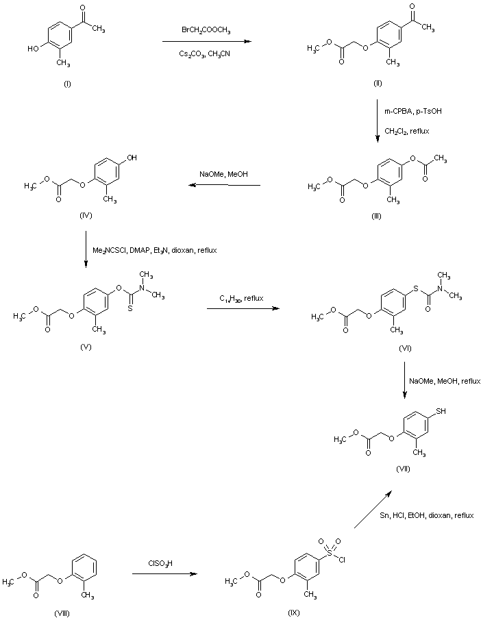 Alkylation of 4'-hydroxy-3'-methylacetophenone (I) with methyl bromoacetate in the presence of Cs2CO3 afforded the aryloxyacetate (II). Baeyer-Villiger rearrangement of the acetophenone moiety using meta-chloroperbenzoic acid produced the aryl ester (III), which was further converted to phenol (IV) by transesterification with methanolic NaOMe. Reaction of (IV) with dimethylthiocarbamoyl chloride gave the O-aryl thiocarbamate (V), which was thermally rearranged to the S-aryl thiocarbamate (VI) in refluxing tetradecane. Then, basic hydrolysis of the thiocarbamate function provided the thiophenol (VII). Alternatively, thiophenol (VII) was obtained by chlorosulfonation of ethyl (2-methylphenoxy)acetate (VIII), followed by reduction of the resultant sulfonyl chloride (IX) with Sn and HCl.