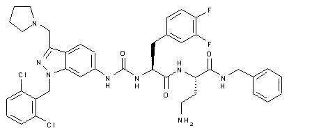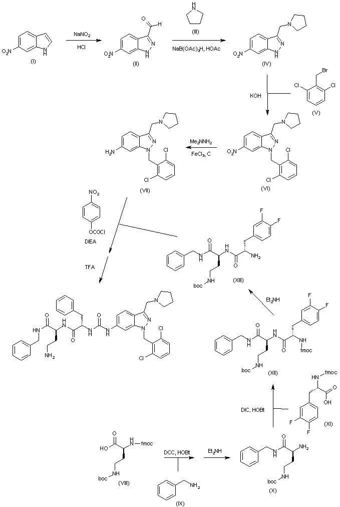 Treatment of 6-nitroindole (I) with aqueous NaNO2 and HCl affords 3-indazolecarboxaldehyde (II), which is then subjected to reductive amination with pyrrolidine (III) by means of NaBH(OAc)3 in dichloroethane/DMF in the presence of acetic acid to provide compound (IV). Alkylation of (IV) with 2,6-dichlorobenzyl bromide (V) by means of KOH in THF yields compound (VI), whose nitro group is reduced with dimethyl hydrazine (Me2NNH2), FeCl3 and charcoal in refluxing MeOH to furnish aminoindazole intermediate (VII). The synthesis of intermediate (XIII) is performed as follows: Coupling of protected diaminobutyric acid (VIII) with benzylamine (IX) by means of DCC and HOBt in acetonitrile, followed by Fmoc removal after treatment with diethylamine, gives derivative (X), which is then condensed with protected difluorophenylalanine (XI) by means of DIC and HOBt in acetonitrile to afford protected dipeptide (XII). Finally, intermediate (XIII) is obtained by Fmoc removal of (XII) by treatment with ethylamine. The desired product is finally obtained by condensation of intermediates (VII) and (XIII) by means of 4-nitrophenyl chloroformate and DIEA in dichloromethane, followed by Boc removal with TFA in dichloromethane.