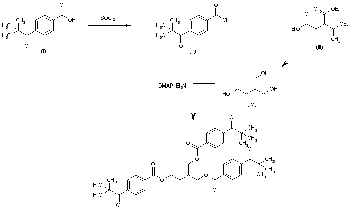 Treatment of 4-(2,2-dimethyl-1-oxopropyl)benzoic acid (I) with thionyl chloride afforded the corresponding acid chloride (II). The title triester was then obtained by acylation of 2-(hydroxymethyl)-1,4-butanediol (IV) with acid chloride (II) in the presence of DMAP or Et3N. The triol (IV) has been obtained by reduction of ethane-1,1,2-tricarboxylic acid triethyl ester (III) with LiAlH4 under standard conditions.