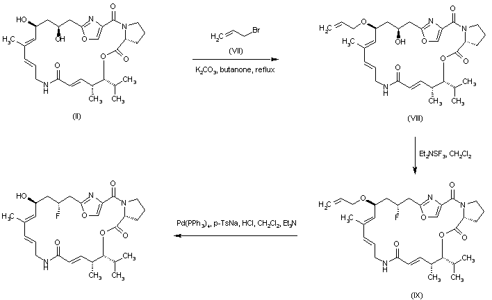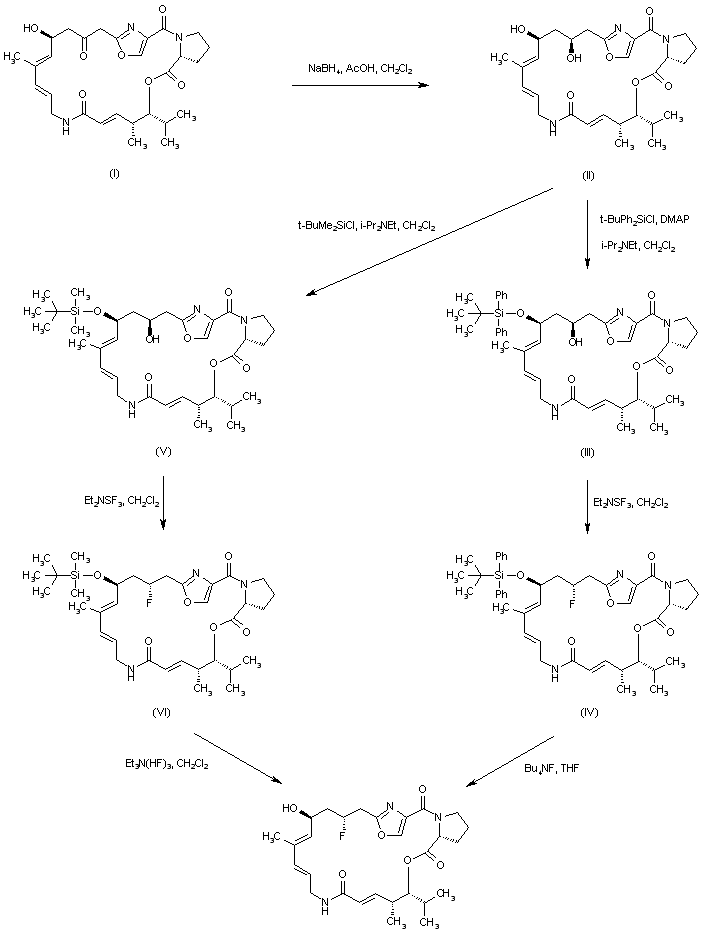 Reduction of the keto function of pristinamycine IIB (I) with NaBH4 in the presence of HOAc afforded diol (II). The 14-hydroxy group of (II) was then selectively protected as the tert-butyldiphenylsilyl ether, yielding (III). Subsequent fluorination of the 16-hydroxyl of (III) was achieved by treatment with diethylaminosulfur trifluoride. Finally, deprotection of the resultant silyl ether (IV) was effected by means of tetrabutylammonium fluoride in THF. A closely related method was based on the protection of (II) as the 14-O-tert-butyldimethylsilyl derivative (V). After fluorination of (V) with diethylaminosulfur trifluoride, the resultant fluoro silyl compound (VI) was deprotected with triethylamine trihydrofluoride.
