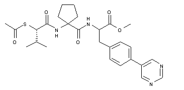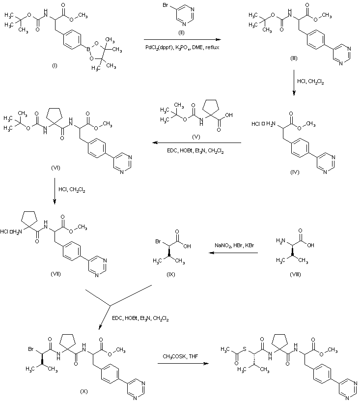 The protected 4-pyrimidinylphenylalanine (III) was prepared by palladium-catalyzed coupling of the boronophenylalanine (I) with the 5-halopyrimidine (II). After acidic cleavage of the N-Boc protecting group of (III), the resultant amino ester (IV) was coupled with N-Boc-cycloleucine (V) to provide dipeptide (VI). Further acidic treatment of (VI) removed the N-Boc group to yield amine (VII). The chiral bromo acid (IX) was obtained by diazotization of D-valine (VIII) in the presence of HBr and KBr. Acylation of the racemic amine (VII) with bromo acid (IX) furnished the corresponding amide (X) as an epimeric mixture. The bromo group of (X) was finally displaced with potassium thioacetate to give the title thioacetate ester.