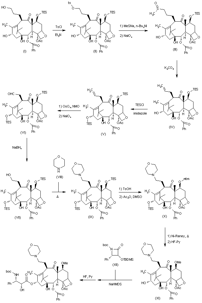 Tosylation of the primary hydroxyl group of (I) affords tosylate (II), which is then subjected to reaction with MeSNa and tetrabutylammonium iodide (n-Bu4NI) in THF followed by oxidation with NaIO4 in MeOH/H2O to provide sulfoxide (III). Derivative (III) is then heated with K2CO3 in 1,2-dichlorobenzene to yield olefin (IV), which is subjected to reaction with triethylsilyl chloride (TESCl) and imidazole in DMF to give the disilylated compound (V). Derivative (V) is then subjected to a Johnson-Remeiux reaction by first treatment with OsO4 and NMO in MeOH/THF/H2O followed by oxidation with NaIO4 in MeOH/THF/H2O to afford aldehyde (VI), which is then reduced by means of NaBH4 in MeOH to furnish alcohol (VII). Reaction between (VII) and morpholine (VIII) in refluxing MeOH affords baccatin III derivative (IX) (1), which is treated with TsOH in MeOH and then with acetic anhydride and DMSO to yield compound (X). Desulfurylation of (X) by refluxing with Raney-Ni in EtOH followed by removal of the TES protecting group by reaction with HF-pyridine affords intermediate (XI), which is finally converted into the desired compound by introduction of the phenylisoserine side-chain using protected beta-lactam (XII) and NaHMDS in THF followed by TBS removal by treatment with HF-pyridine.