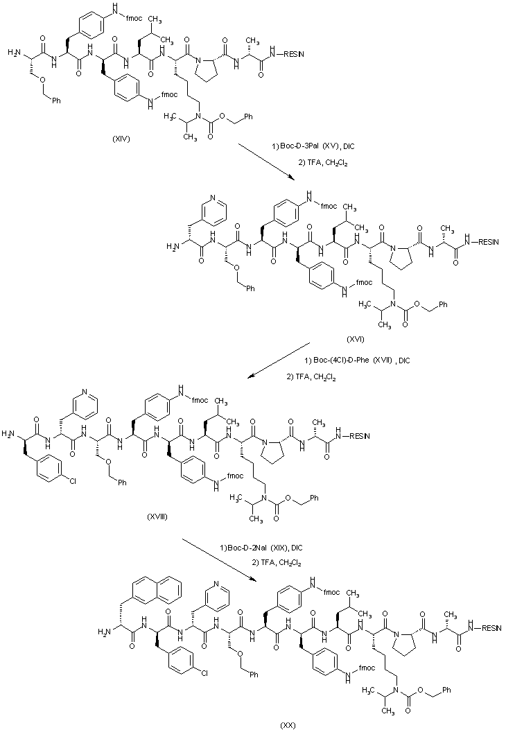 Coupling/deprotection cycles with N-Boc-D-(3-pyridyl)alanine (XV), N-Boc-D-4-chlorophenylalanine (XVII) and N-Boc-D-(2-naphthyl)alanine (XIX) furnished the peptide resins (XVI), (XVIII) and (XX).