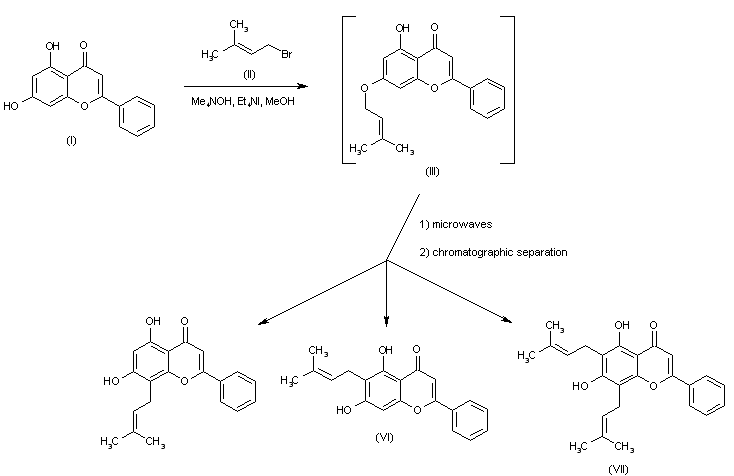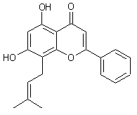 In an improved procedure, chrysin (I) was alkylated with prenyl bromide (II) under phase-transfer conditions, and the resulting prenyl ether (III) was subsequently rearranged under microwave irradiation to produce a mixture of the title compound as the major product along with the 6-prenyl (VI) and the 6,8-diprenyl (VII) derivatives, which were separated by column chromatography.