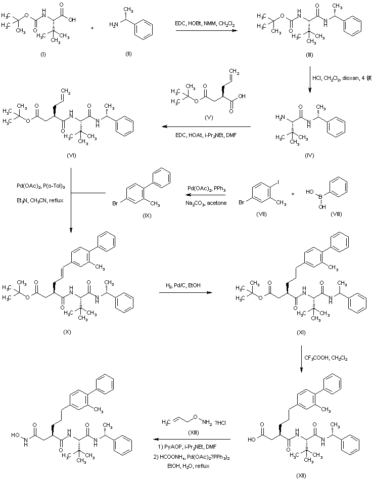 Coupling of N-Boc-L-tert-leucine (I) with (R)-1-phenylethylamine (II) using EDC and HOBt gave amide (III) which, after acid cleavage of the N-Boc group, provided amino amide (IV). Acylation of amine (IV) with (R)-2-allylsuccinic acid 4-tert-butyl ester (V) afforded the diamide (VI). Biphenylyl bromide (IX) was prepared by the Suzuki coupling between 5-bromo-2-iodotoluene (VII) and phenylboronic acid (VIII). The biaryl group was then introduced via Heck reaction of biphenylyl bromide (IX) with olefin (VI), yielding adduct (X). Subsequent hydrogenation of the olefin double bond of (X) over Pd/C afforded (XI). Carboxylic acid (XII) was then obtained by trifluoroacetic acid-promoted cleavage of the tert-butyl ester group of (XI). Conversion of (XII) to the title hydroxamic acid was then achieved by coupling of carboxylic acid (XII) with O-allylhydroxylamine (XIII), followed by O-allyl group cleavage in the presence of ammonium formate and palladium catalyst.
