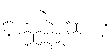Treatment of methyl 4-chloroanthranilate (I) with iodine and silver sulfate afforded the 5-iodinated derivative (II). The amino group of (II) was then protected by acylation with acetyl chloride to give amide (III). Carbonylation of the aryl iodide (III) with palladium catalyst under CO atmosphere in DMF/MeOH provided the isophthalate diester (IV). Acid hydrolysis of the acetamido group of (IV), followed by acylation of the resultant amine (V) with 3,4,5-trimethylphenylacetyl chloride, (VI) furnished amide (VII). Quinolone (VIII) was then formed by cyclization of (VII) under basic conditions. Subsequent Mitsunobu coupling of (VIII) with (S)-N-Boc-2-(2-hydroxyethyl)azetidine (IX) provided ether (X). After hydrolysis of the methyl ester of (X) with LiOH, the resulting acid (XI) was coupled with 4-aminopyrimidine (XII) in the presence of EDC to give amide (XIII). The N-Boc group of (XIII) was then deprotected by treatment with trifluoroacetic acid, and the title compound was isolated after conversion to the dihydrochloride salt.