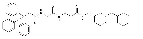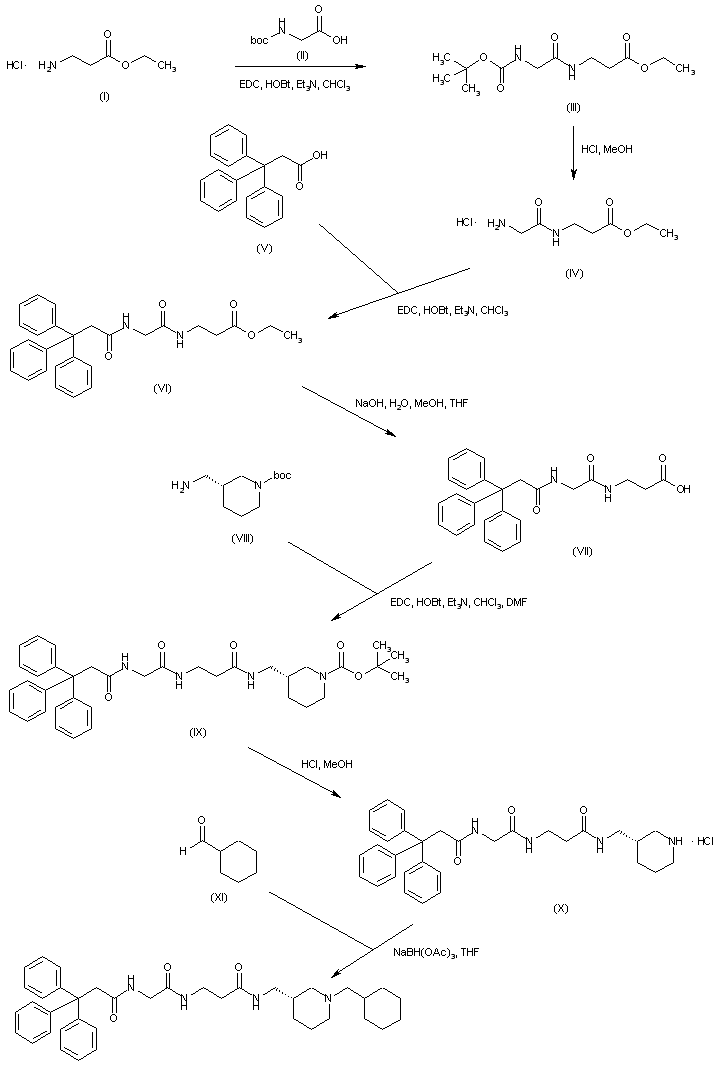 Coupling between ethyl 3-aminopropionate (I) and N-Boc-glycine (II) by means of EDC and HOBt affords the protected dipeptide (III). After acidic Boc group cleavage in (III), the N-deprotected dipeptide (IV) is acylated by 3,3,3-triphenylpropionic acid (V) to produce amide (VI). Saponification of the ethyl ester group of (VI) yields acid (VII). This is coupled with (R)-1-Boc-3-(aminomethyl)piperidine (VIII) to afford amide (IX), which is further subjected to acidic N-Boc group cleavage. The resultant piperidine derivative (X) is then reductively condensed with cyclohexanecarboxaldehyde (XI) in the presence of NaBH(OAc)3 to furnish the title compound.