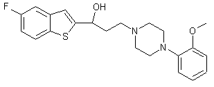 Friedel-Crafts acylation of 5-fluorobenzothiophene (I) with 3-chloropropionyl chloride (II) in the presence of AlCl3 furnished the chloroketone (III). This was then condensed with N-(2-methoxyphenyl)piperazine (IV) to afford the piperazinyl ketone (V). Reduction of the keto group of (V) with NaBH4 then gave the title alcohol.