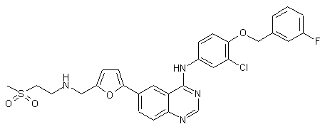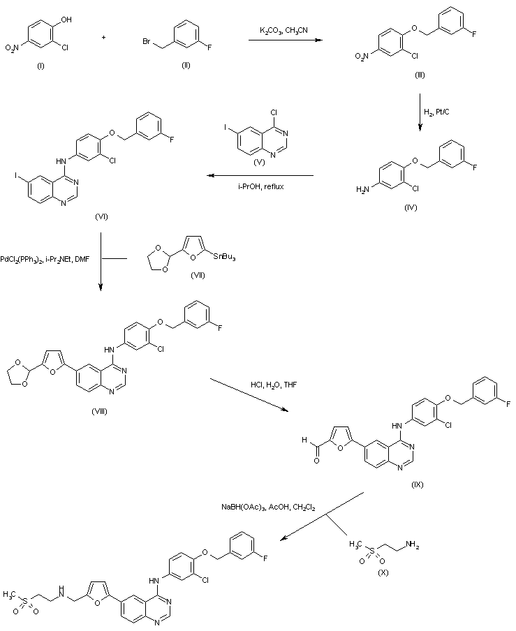 Williamson's ether synthesis between 2-chloro-4-nitrophenol (I) and 3-fluorobenzyl bromide (II) afforded ether (III). The nitro group of (III) was then reduced to the aniline (IV) by means of catalytic hydrogenation over Pt/C. Condensation of aniline (IV) with 4-chloro-6-iodoquinazoline (V) furnished the diaryl amine (VI). Subsequent Stille coupling between iodide (VI) and 5-dioxolanyl-2-(tributylstannyl)furan (VII) gave rise to adduct (VIII), which was further subjected to acid hydrolysis of the cyclic ketal to yield aldehyde (IX). Finally, reductive amination of (IX) with 2-(methanesulfonyl)ethylamine (X) in the presence of sodium triacetoxyborohydride provided the title compound.