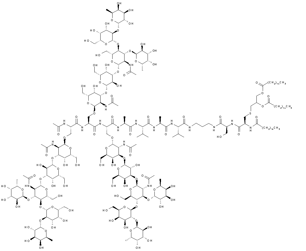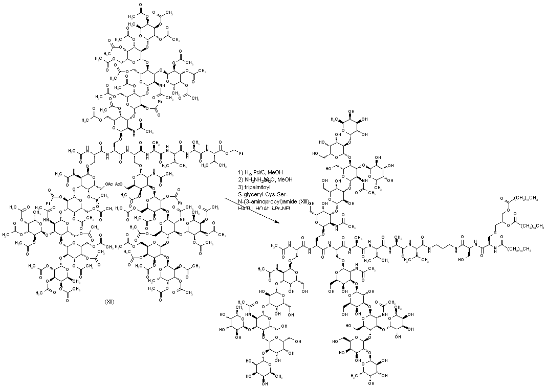 Hydrogenolysis of the benzyl ester group of (XII) and subsequent hydrazinolysis of the acetate and benzoate esters afforded the fully deprotected product, which was finally coupled with tripalmitoyl S-glyceryl-Cys-Ser-N-(3-aminopropyl)amide (XIII) to furnish the title compound.
