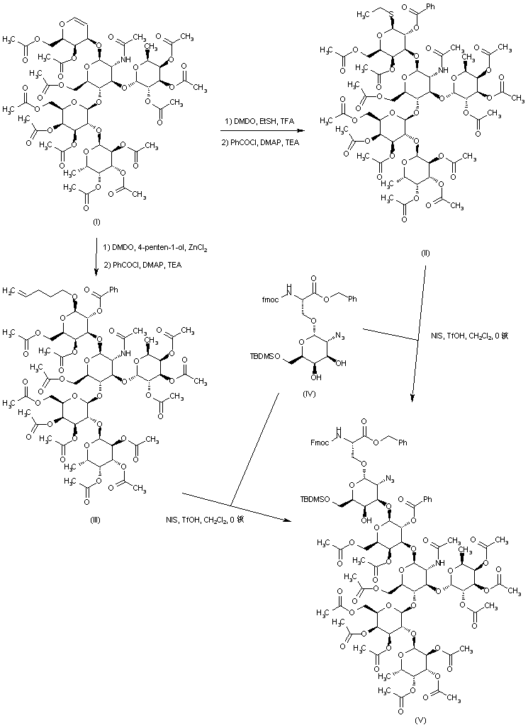 The protected pentasaccharide (I) was converted to the corresponding thioglycoside by epoxidation with dimethyldioxirane followed by epoxide opening with ethanethiol in the presence of trifluoroacetic acid. Subsequent acylation of the free hydroxyl group with benzoyl chloride afforded the thioglycoside benzoate (II). Alternatively, treatment of (I) with dimethyldioxirane in the presence of 4-penten-1-ol and ZnCl2 and subsequent O-benzoylation furnished the pentenyl benzoate (III). Condensation of either the thioethyl donor (II) or the pentenyl donor (III) with the protected serine glycoside acceptor (IV) using N-iodosuccinimide and triflic acid afforded the coupled product (V).