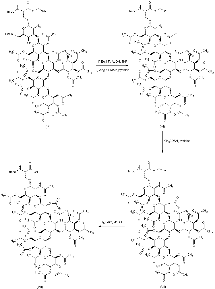 Desilylation of (V) with tetrabutylammonium fluoride followed by acetylation of the free hydroxyl groups provided the fully acylated compound (VI). Reductive acetylation of the azido group of (VI) using a 1:1 mixture of thioacetic acid and pyridine gave rise to the acetamide (VII). The benzyl ester of (VII) was then cleaved by hydrogenolysis over Pd/C to yield the carboxylic acid (VIII).