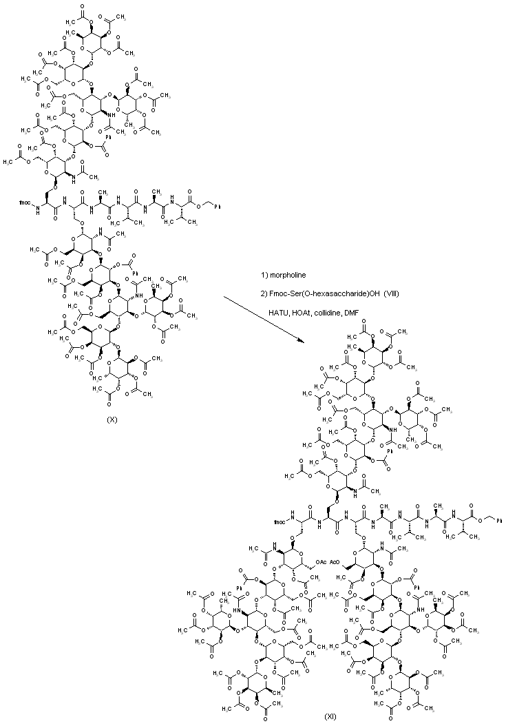 Coupling of the protected serine O-hexasaccharide (VIII) with the tetrapeptide ester Ala-Val-Ala-Val-OBn (A) by means of HATU afforded the Fmoc-pentapeptide O-hexasaccharide (IX). The Fmoc group of (IX) was then deprotected by treatment with morpholine, and the deprotected amine was coupled with a second unit of Fmoc-Ser(O-hexasaccharide) (VIII) to produce adduct (X).