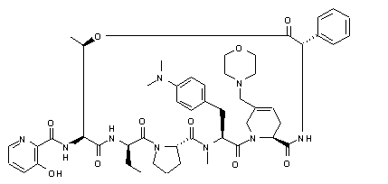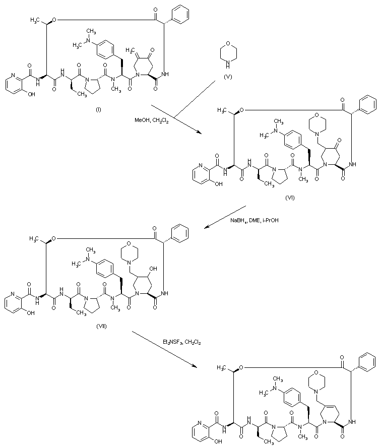 Reduction of the keto group of 5-delta-methylene pristinamycin IA (I) by means of NaBH4 in the presence of CeCl3 provided the allyl alcohol (II). Subsequent chlorination of (II) with SOCl2, furnished a mixture of compounds containing the 5-delta-(chloromethyl) (III) and the 5-gamma-chloro-5-delta-methylene (IV) derivatives. Treatment of the crude mixture with morpholine (V) in refluxing acetonitrile yielded the title 5-delta-morpholinomethyl analogue.