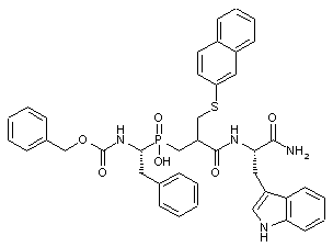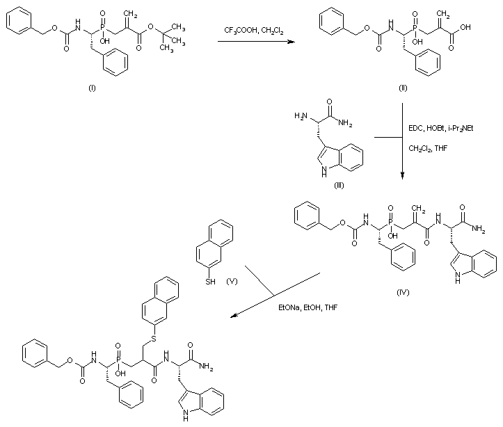 The title compound was prepared starting from the phosphinic dipeptide (I). Deprotection of the tert-butyl ester of (I) under acidic conditions afforded the carboxylic acid (II). This was then coupled with tryptophan amide (III) using EDC and HOBt to produce (IV). Finally, conjugate addition of 2-naphthalenethiol (V) to (IV) in the presence of NaOEt furnished the target thioether.