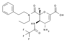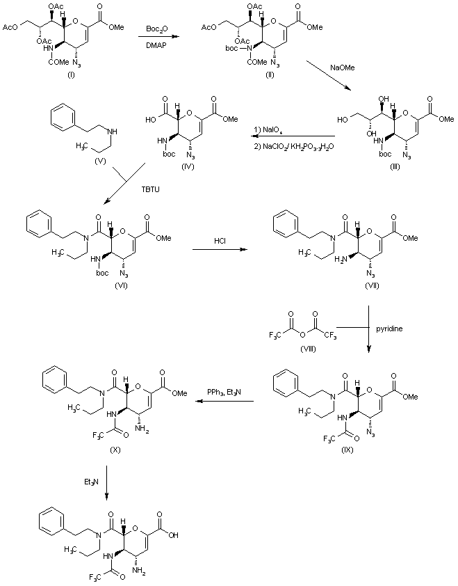 Introduction of a Boc protecting group on derivative (I) by treatment with tert-butyldicarbonate and DMAP in dioxane affords 5-N-Boc derivative (II), which is then deacetylated by reaction with NaOMe in MeOH to provide compound (III). Conversion of trihydroxy derivative (III) into carboxylic acid (IV) is performed by first oxidation with sodium periodate in MeOH/H2O followed by treatment with sodium chlorite/potassium dihydrogen orthophosphate in tert-BuOH. Coupling of (IV) with secondary amine (V) by means of TBTU in THF yields phenethylpropyl carbamoyl derivative (VI), whose Boc group is removed by means of HCl in dioxane to give primary amine (VII). Condensation of (VII) with trifluoroacetic anhydride (VIII) in pyridine furnishes trifluoroacetylamino derivative (IX), whose azide group is reduced by means of PPh3 and Et3N in THF/H2O to yield 4-amino derivative (X). Finally, the desired product is obtained by saponification of the methyl ester group of (X) by heating with Et3N in H2O.