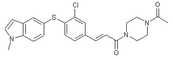 Reaction of 3,4-dichlorobenzalzehyde (I) with methyl 3-mercaptopropionate in the presence of K2CO3 in hot DMF afforded the thioether (II). Subsequent condensation of (II) with malonic acid under Knoevenagel conditions produced the substituted cinnamic acid (III), which was further converted to the corresponding acid chloride (IV) upon treatment with oxalyl chloride and a catalytic amount of DMF. Coupling of acid chloride (IV) with N-acetylpiperazine (V) furnished amide (VI). Treatment of (VI) with potassium tert-butoxide caused the elimination of methyl acrylate, producing the potassium thiolate (VII). Thiolate (VII) was then condensed with 1-methyl-7-bromoindole (VIII) to give the title compound.