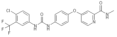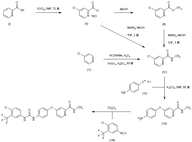 Reaction of picolinic acid (I) with hot thionyl chloride in DMF gives 4-chloropyridine-2-carbonyl chloride (II), which is treated with methanol to give ester (III). Subsequent displacement of the methyl ester function with methylamine provides amide (IV). Alternatively, acid chloride (II) is directly converted into amide (IV) by reaction with a cold solution of methylamine. In a different synthetic procedure, amide (IV) can be obtained from 4-chloropyridine (V) via the Menisci reaction using N-methylformamide and hydrogen peroxide in the presence of FeSO4 and H2SO4. Coupling of the amide (IV) with potassium 4-aminophenolate (VI) -obtained by treatment of 4-aminophenol (VII) with potassium tert-butoxide- in hot DMF yields the pyridyloxyaniline (VIII). Aniline (VIII) is finally condensed with either 4-chloro-3-(trifluoromethyl)phenyl isocyanate (IX) in CH2Cl2 or 4-chloro-3-(trifluoromethyl)aniline (X) by means of CDI in CH2Cl2.