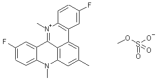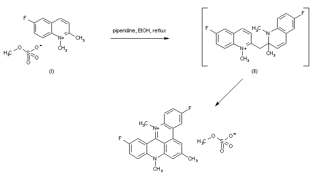 The title compound was obtained in a one-pot procedure by dimerization of 1,2-dimethyl-6-fluoroquinolinium methosulfate (I) in ethanolic piperidine, giving intermediate (II), which spontaneously rearranged to the title quinoacridinium salt.