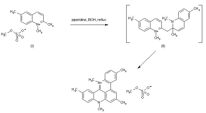 The title compound was obtained in a one-pot procedure by dimerization of 1,2,6-trimethylquinolinium methosulfate (I) in ethanolic piperidine, giving intermediate (II), which spontaneously rearranged to the title quinoacridinium salt.