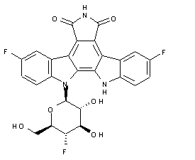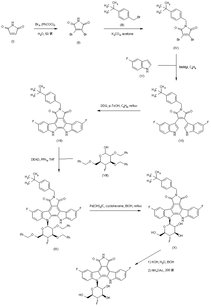 Maleimide (I) was brominated in the presence of benzoyl peroxide to give 3,4-dibromomaleimide (II). Alkylation of (II) with 4-(tert-butyl)benzyl bromide (III) in the presence of potassium carbonate afforded the N-(tert-butylbenzyl) derivative (IV). Coupling of the dibromomaleimide (IV) with the indolylmagnesium iodide resulting from 5-fluoroindole (V) and MeMgI furnished the bis-indolyl maleimide (VI). Oxidative cyclization of (VI) using dicyanodichlorobenzoquinone yielded the target indolopyrrolocarbazole system (VIII). Glycosylation of (VIII) with the protected fluoro glucose derivative (VIII) under Mitsunobu conditions afforded adduct (IX). The O-benzyl protecting groups were then removed by transfer hydrogenation with cyclohexene and Pd(OH)2 to give (X). The tert-butylbenzyl group was finally removed by basic hydrolysis followed by recyclization with fused ammonium acetate.