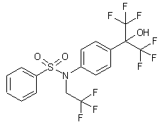 Treatment of aniline (I) with hexafluoroacetone trihydrate (II) and p-toluenesulfonic acid affords derivative (III), which is then derivatized with trifluoroacetic anhydride (IV) to provide trifluoroacetanilide derivative (V). Reduction of (V) by means of LiAlH4 in refluxing THF yields N-trifluoroethylaniline derivative (VI), which is finally converted into the target sulfonamide by reaction with benzenesulfonyl chloride (VII) in pyridine.