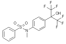| 合成路线图解说明: Treatment of aniline (I) with hexafluoroacetone trihydrate (II) and p-toluenesulfonic acid affords derivative (III), which is then derivatized with trifluoroacetic anhydride (IV) to provide trifluoroacetanilide derivative (V). Reduction of (V) by means of LiAlH4 in refluxing THF yields N-trifluoroethylaniline derivative (VI), which is finally converted into the target sulfonamide by reaction with benzenesulfonyl chloride (VII) in pyridine. |