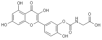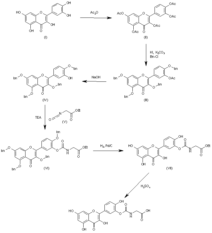 The acylation of quercetin (I) with acetic anhydride in sulfuric acid gives the pentaacetate (II), which by reaction with KI, K2CO3 and benzyl chloride in refluxing butanone yields the 3'-acetoxy tetrabenzyloxy compound (III). The hydrolysis of the acetate group of (III) with NaOH in refluxing methanol/acetone/water affords the 3'-hydroxy compound (IV), which is condensed with ethyl 2-(isocyanato)acetate (V) and TEA in hot THF to provide the carbamate (VI). Cleavage of the benzyloxy groups of (VI) with H2 over Pd/C in THF gives the tetrahydroxy compound (VII), which is finally hydrolyzed with sulfuric acid in refluxing THF to yield the target prodrug.