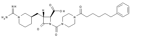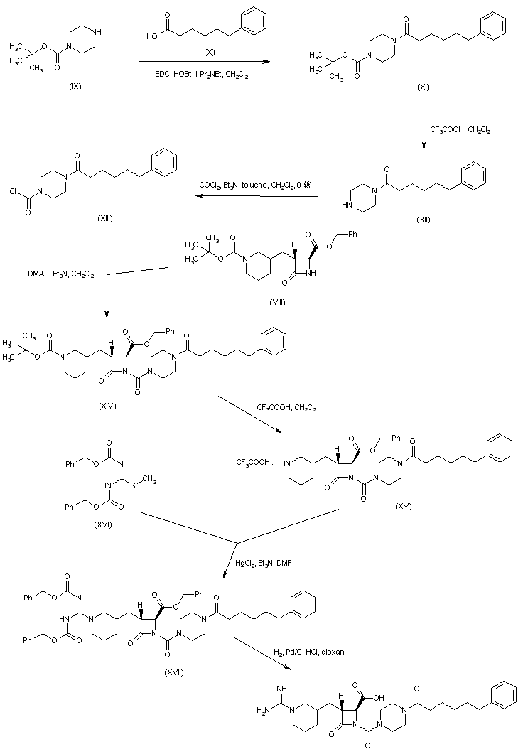 Coupling of 6-phenylhexanoic acid (X) with N-Boc-piperazine (IX) to give (XI), followed by acid deprotection of the Boc group of (XI), provided (6-phenylhexanoyl)piperazine (XII). This was converted to the carbamoyl chloride (XIII) upon treatment with phosgene. The condensation of carbamoyl chloride (XIII) with azetidinone (VIII) gave rise to the urea derivative (XIV). After acid cleavage of the Boc protecting group of (XIV), the resulting piperidine (XV) was condensed with N,N'-dicarbobenzoxy-S-methylisothiourea (XVI) in the presence of HgCl2, yielding the protected guanidine (XVII). This was finally deprotected by catalytic hydrogenolysis over Pd/C.