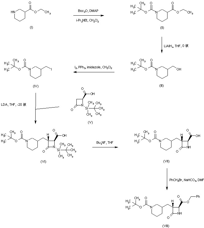 Ethyl nipecotate (I) was protected as the N-Boc derivative (II) and subsequently reduced to alcohol (III) by means of LiAlH4. Conversion of alcohol (III) into iodide (IV) was achieved by treatment with iodine and triphenylphosphine. The dianion of the chiral azetidinecarboxylic acid (V) was alkylated with iodide (IV) to furnish adduct (VI) as a diastereomeric mixture that was desilylated to (VII) using tetrabutylammonium fluoride. Benzyl ester (VIII) was then obtained by reaction of carboxylic acid (VII) with benzyl bromide and NaHCO3.