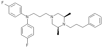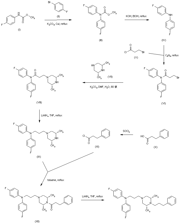 The CuI-assisted coupling between methyl N-(4-fluorophenyl)carbamate (I) and 1-bromo-4-fluorobenzene (II) produced the N,N-bis(4-fluorophenyl)carbamate (III), which was subsequently hydrolyzed to bis(4-fluorophenyl)amine (IV) using ethanolic KOH. Acylation of diarylamine (IV) with 3-bromopropionyl chloride (V) gave bromopropionamide (VI). This was then condensed with cis-2,6-dimethylpiperazine (VII) to yield the 3-piperazinylpropionamide (VIII). Amide reduction with LiAlH4 provided the triamino compound (IX). Acid chloride (XI), prepared from hydrocinnamic acid (X), was then coupled with piperazine (IX) to furnish amide (XII). The amide function was finally reduced to the corresponding amine by using LiAlH4.