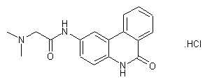 | 合成路线图解说明: Treatment of 9-fluorenone (I) with H2SO4 and sodium azide furnishes phenanthridinone derivative (II), which is then nitrated by means of HNO3 in HOAc to provide compound (III). Reduction of the nitro moiety of (III) by means of Fe and NH4Cl in DMF affords amino derivative (IV), which is then acylated with chloroacetyl chloride (V) in ethyl acetate in the presence of NaHCO3 or pyridine/DMF to yield chloroacetamide derivative (VI). Finally, the target compound can be obtained by condensation of (VI) with dimethyl amine (VII) in DMF/MeOH followed by treatment with HCl/Et2O in MeOH. Alternatively, the desired product can be synthesized as follows: Treatment of 2-amino-9-fluorenone (VIII) with chloroacetyl chloride (V) in AcOEt and NaHCO3 gives chloroacetamide (IX), which is then subjected to reaction with dimethyl amine (VII) in DMF/MeOH to provide dimethylacetamide (X). Reaction of (X) with H2SO4 and sodium azide, followed by treatment with HCl/Et2O in MeOH, affords a mixture of regioisomers from which the desired compound is isolated. |