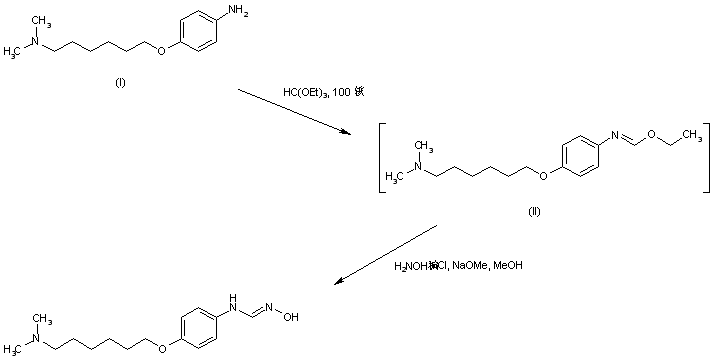 Aniline (I) is condensed with triethyl orthoformate at 100 C to produce the intermediate imidate (II) which, upon treatment with hydroxylamine, gives rise to the target N-hydroxy formamidine.