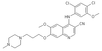 Alkylation of 4-hydroxy-5-methoxy benzoic acid methyl ester (I) with 3-chloropropyl p-toluene sulfonate (III) by means of K2CO3 and methyl-tricapryl ammonium chloride (Aliquat 128) in refluxing acetone affords compound (III), which is then nitrated by means of HNO3 in HOAc to furnish 2-nitro derivative (IV). Reduction of the nitro moiety of (IV) by means of Fe in H2O/MeOH in the presence of ammonium chloride yields 2-amino compound (V), which is subjected to reaction with refluxing dimethylformamide dimethylacetal (VI) to provide amidine (VII). Condensation of (VII) with acetonitrile by means of n-BuLi in hexane/THF/HOAc gives substituted quinoline-carbonitrile (IX), whose hydroxyl group is replaced by a chlorine by treatment of (IX) with refluxing POCl3 to afford compound (X). Coupling of (X) with 2,4-dichloro-5-methoxyaniline (XI) in 2-ethoxyethanol in the presence of pyridine hydrochloride yields compound (XII), which is finally converted into the desired compound by condensation with 1-methylpiperazine (XII) by means of NaI in refluxing ethylene glycol dimethyl ether.