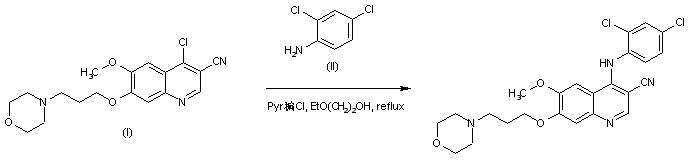 The alkylation of 4-hydroxy-3-methoxybenzoic acid methyl ester (I) with 3-(4-morpholinyl)propyl chloride (II) and tetrabutylammonium chloride in refluxing butanone gives 3-methoxy-4-[3-(4-morpholinyl)propoxy]benzoic acid methyl ester (III), which is nitrated with HNO3 in hot acetic acid to yield 5-methoxy-4-[3-(4-morpholinyl)propoxy]-2-nitrobenzoic acid methyl ester (IV). The reduction of (III) with H2 over Pd/C in methanol/ethyl acetate to afford the corresponding 2-amino ester (V), which is condensed with dimethylformamide dimethylacetal (VI) by heating at 100 C to provide the 2-(dimethylaminomethyleneamino) derivative (VII). The cyclization of (VII) with acetonitrile (VIII) by means of BuLi and CO2 in THF gives 6-methoxy-7-[3-(4-morpholinyl)propoxy]-4-oxo-1,4-dihydroquinoline-3-carbonitrile (IX), which is treated with refluxing SOCl2 to yield the 4-chloroquinoline derivative (X). Finally, this compound is condensed with 2-bromo-5-methoxyaniline by means of pyridine hydrochloride in 2-ethoxyethanol or NaH in THF (or DMF).
