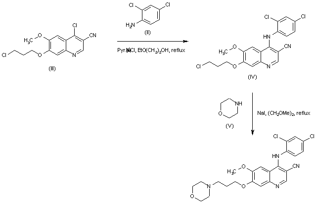 In an alternative synthesis, the chloropropoxy derivative (III) was similarly condensed with 2,4-dichloroaniline (II) to give (IV), which was then treated with morpholine (V), yielding the title compound.