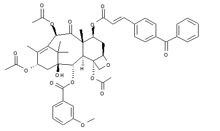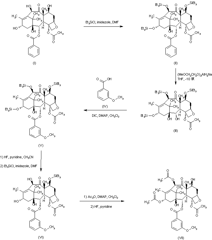 | 合成路线图解说明: 10-Deacetylbaccatin III (I) was protected by treatment with triethylsilyl chloride and imidazole, and the resulting trisilylated compound (II) was debenzoylated to diol (III) by using Red-Al(R). Coupling of (III) with m-anisic acid (IV) yielded the m-methoxybenzoate ester (V). Complete desilylation of (V), followed by selective resilylation at C-7 with triethylsilyl chloride, furnished (VI). Acylation at C-10 and C-13 by means of Ac2O and DMAP, followed by desilylation, gave the modified baccatin (VII). |